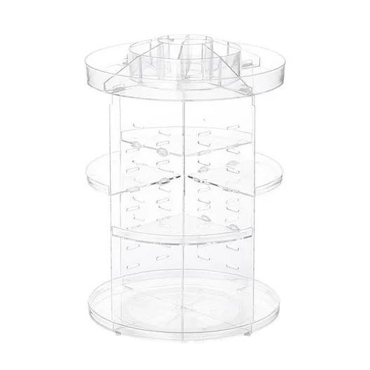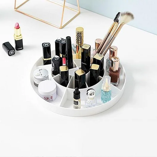 The 360° Rotation Makeup Organizer is a great design for women. It perfectly organizes and stores your cosmetics, including lipsticks, lip gels, nail polish, makeup brushes, cheek color, eyebrow pencils, foundation sticks, beauty gadgets, necklaces, rings and more. It would be a great addition to your bedroom,bathroom,counter,dresser and vanity to keep them a lot neater looking.